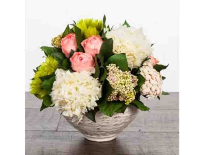 Preserved florals in ceramic cream bowl. With preserved roses, hydrangea, button flowers, everlasting flowers, rice flowers and lemon leaves.