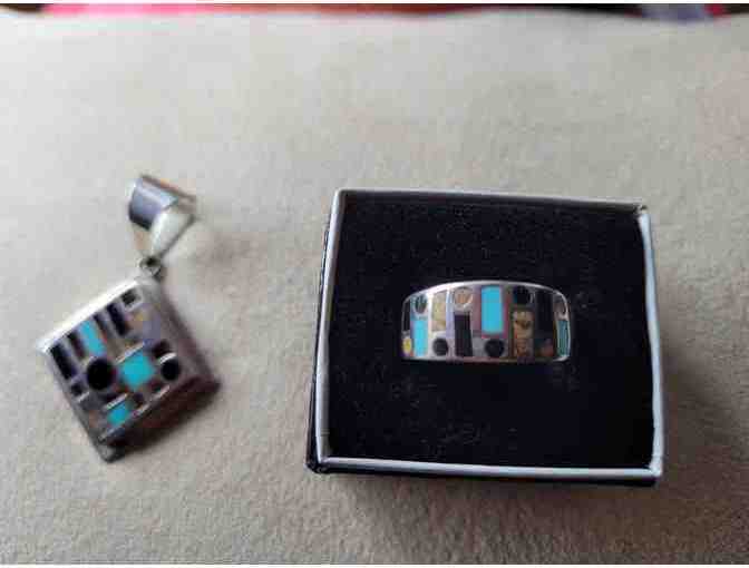 Matching ring and pendant, sterling silver, native American made. Ring is a women's size 8. Pendant is 1 inch square.
