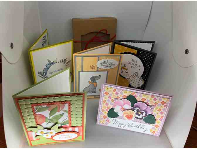 Hand crafted by a NMDR volunteer, this box of 5 hand stamped birthday cards cones with envelopes!