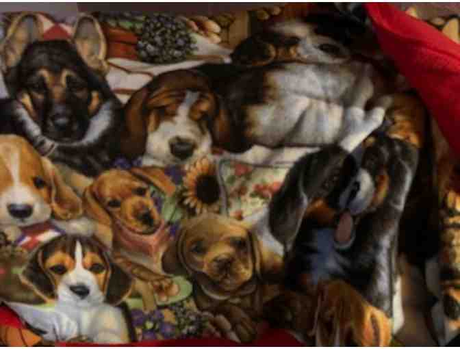 Handmade 36x36 anti-pill plush fleece dog blanket, tied (no knots), double sided with dogs on one side, red anti-pill plush fleece on other.