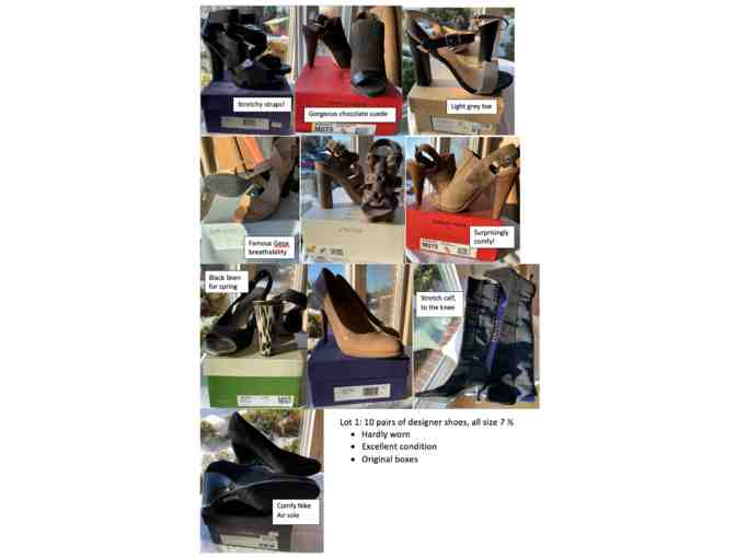 Lot 1 of 10 pairs of hardly or never-worn designer shoes in their original brand boxes. Kate Spade, Stuart Weitzman, Donald Pliner. Retail value over $1,500.