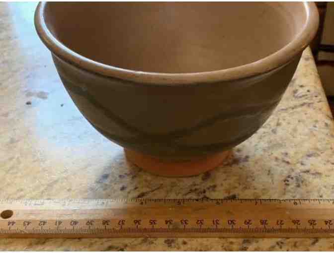 Two stacking ceramic bowls of medium size. One is blue and merlot, the other is tan with black lines on outside and creme on inside.