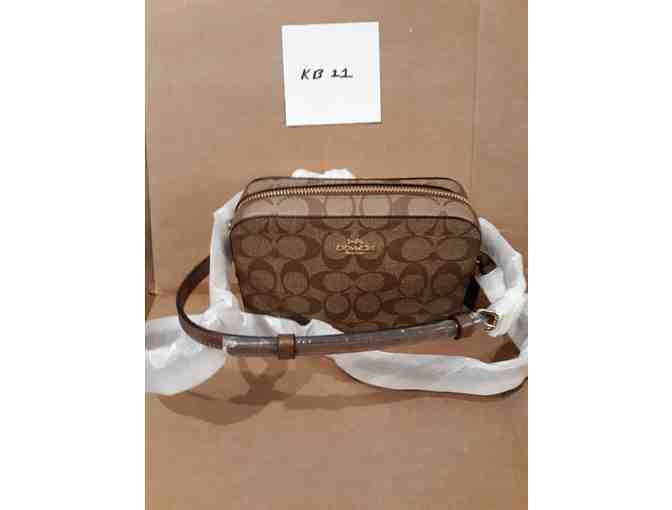 COACH brown fabric crossbody bag…52” long leather permanent strap is adjustable…bag is 7” long, 5” high, 2” wide…brown fabric interior has 2 cc holders and one open wide pouch