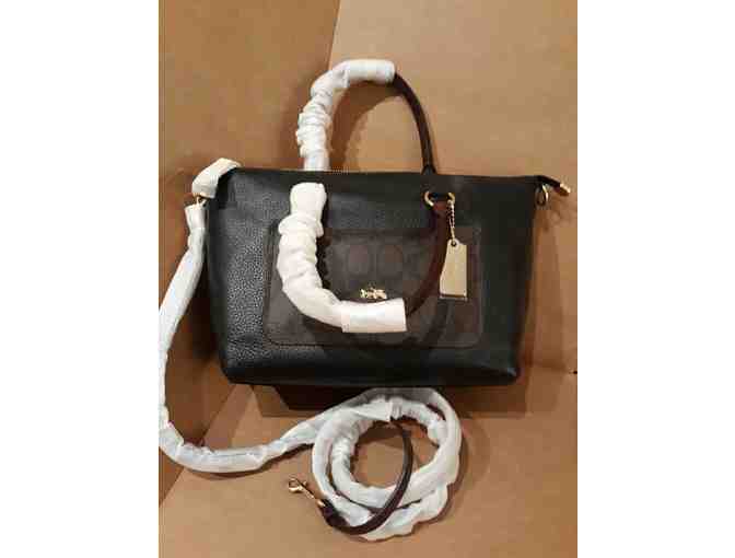 COACH black leather purse w/brown trim…brown handles, brown shoulder strap, brown outer pouch w/ COACH logo…removable 46” leather strap…brown fabric interior has one small open pouch