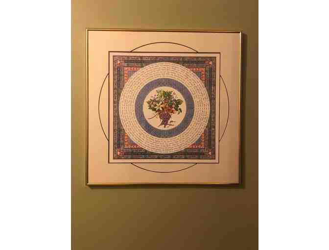 This lovely print of the Song of Solomon (Song of Songs) includes a vividly rendered bouquet of tulips, hyacinths, lilies, apricots, figs, and grapes encircled by one of the world's great love poems. The framed print measures 23"x23."