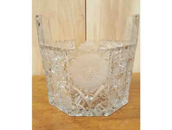 Technically this would be called an ice "bucket" but it's far too beautiful for a bucket thus our term "basket". The age or provenance of this lovely piece is not known, likely Polish or Czech. It is richly decorated with cuts and etchings, and in perfect condition. The base and sides are octagonal, with floral and geometric patterns.
