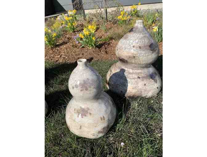 Pair of glazed pottery urns from Thailand - suitable for outside or inside, but please protect from frost. Glazing exhibits characteristic craze crack design.