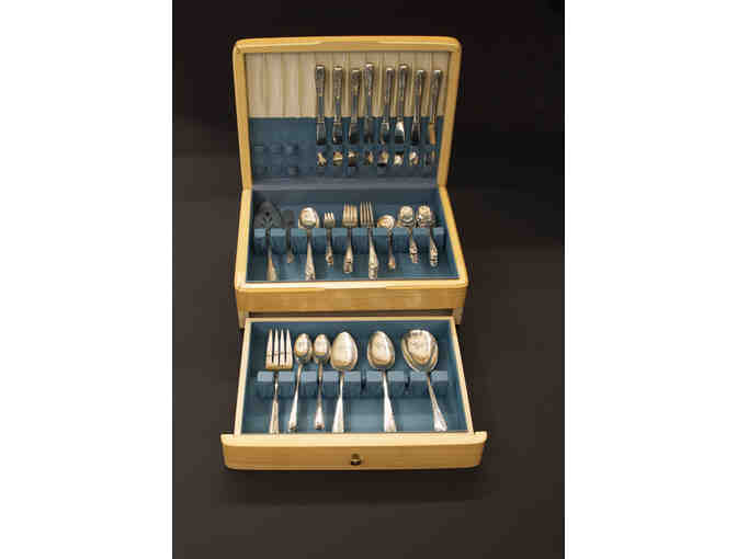 This Extra Plate Silverplate silverware was manufactured by Rogers Bros. circa 1955. The pattern is "Chased Rose".  Silverware comes in the traditonal wooden box with the velvet lining.  Includes 64 pieces plus 7 serving items--71 pieces in all.