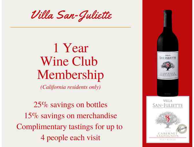 One-year subscription to Villa San-Juliette wine club, for California residents only. One year from when the subscription is begun (please begin before June or September shipment of 2022*). 25% savings on bottle purchases. 15% savings on merchandise. Complimentary tastings for up to 4 people per visit. *Shippings happen in March, June, September, and December.