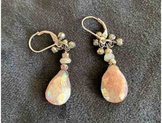 The high bidder wins these striking sunstone earrings with pyrite beads and sterling silver. Known for its lively glitter -- aventurescence -- sunstone is coveted by innovative jewelry designers.