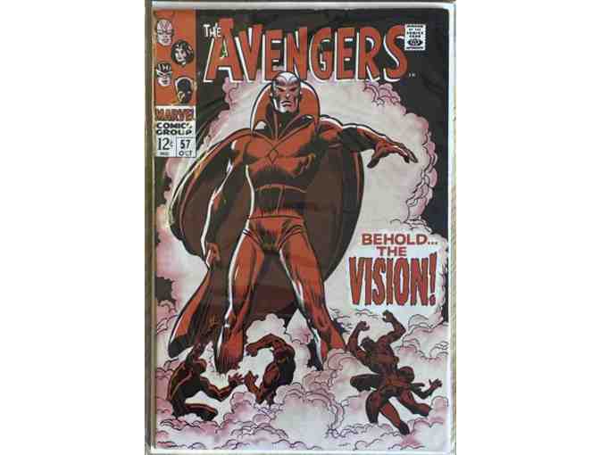 1st appearance of the Vision. The Vision attacks the Avengers. Soon he overcomes his programming and reveals to the Avengers that he was created by Ultron. Together, Vision and the Avengers go to Ultron's lair and eventually defeat him thanks to The Vision.