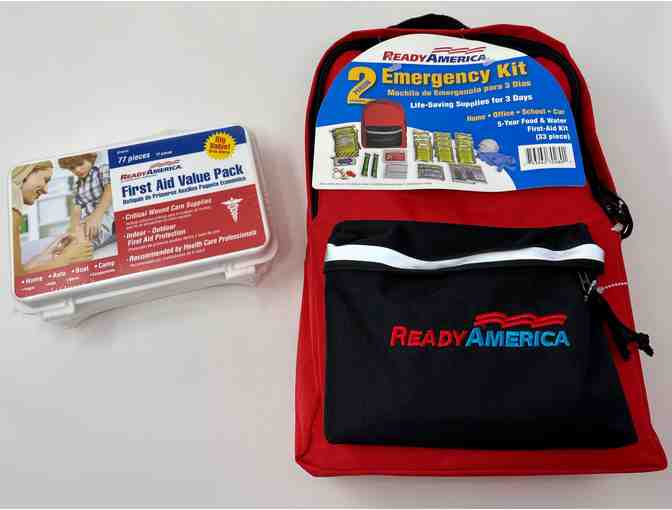 Includes: A 2-person Emergency Kit which includes life-saving supplies for 3 days and a 77 piece First Aid kit
