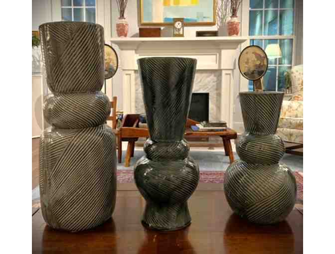 A trio of contemporary styled accent pieces from Ethan Allen, these vases are handsculpted in ceramic and feature an abstract linear design.