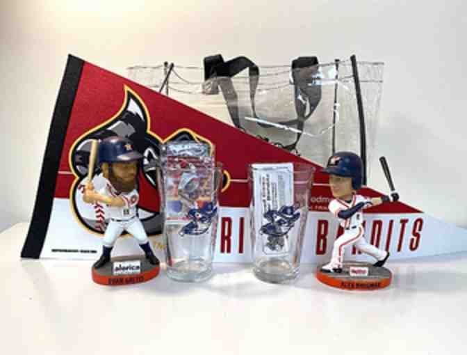 Take the family out to the ball game with this Quad City River Bandits bundle! Packaged within a clear stadium tote is everything you need for a night at the ball game - you will recieve 4 general admission tickets, 2 glass tumblers, 2 packs of baseball cards, 1 Alex Bregman Bobblehead, 1 Evan Gattis Bobblehead, and 1 River Bandits pennant.