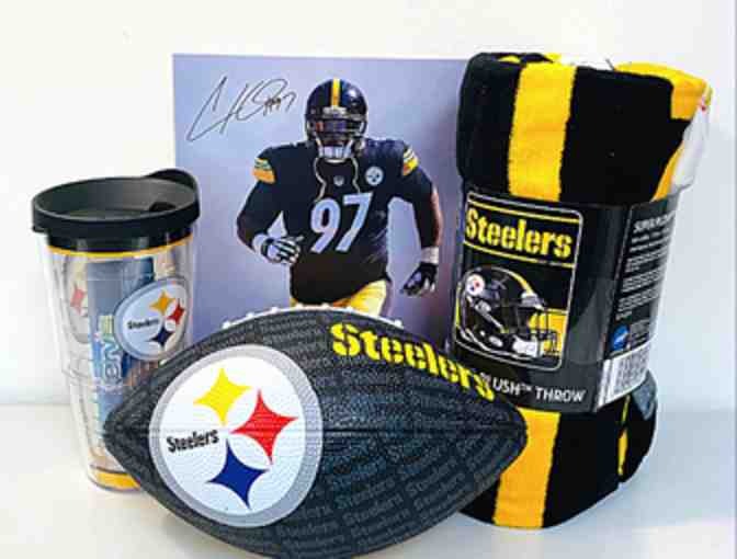 Any Steeler fan would be excited for this package! This package includes 1 lithograph photo signed by Cameron Heyward (8.5 x11), a youth sized Steelers football, a 24oz Tervis insulated cup to show your team spirit anywhere you go, & a cozy plush throw blanket to use during the big games!