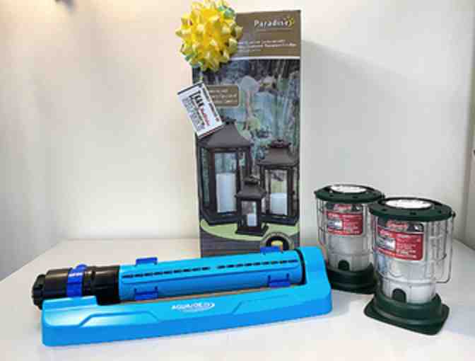 Add to your backyard ambiance with this backyard essential package! This package offers a set of 3 black, metal, flameless, battery operated lanterns to light up your space, 2 Coleman citronella candles to keep the bugs away, and an oscillating sprinkler so you can water the yard at night, and enjoy the greenery during the day.
