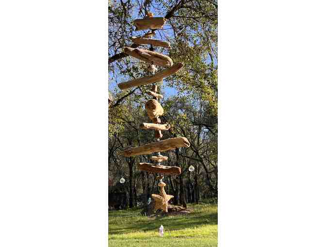 The kinitec sculpture is 6.5 Feet long and about 3 Feet wide. It's decorated with Sea Glass Beads, Shells, a beautiful Star Fish and Crystal Glass prisms. Some of the wood came from the Dandelion Class Room.