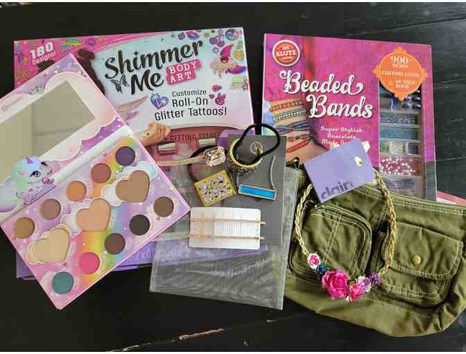 Shimmer Me Body Art, Klutz-Beaded Bands, Mossimo purse, Claire's headband, hair clips, and Marvycorn cosmetics.
