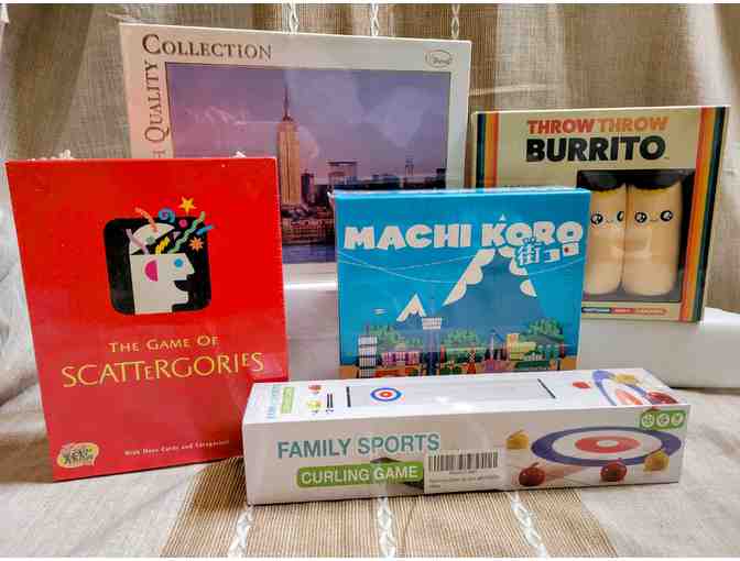 Machi Koro game, Throw Throw Burrito, Scattergories, 500 piece NYC puzzle, and a Curling game.