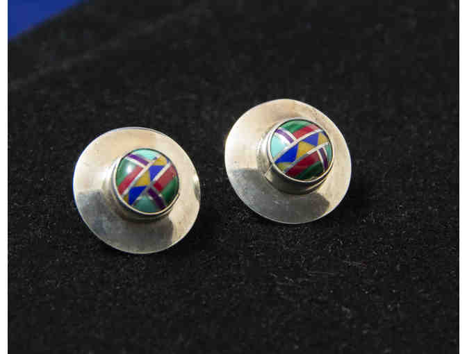 Elegant stud earrings! Wide band of sterling silver surrounds a domed center of colorful semi-precious stone inlay. Previously owned; in excellent condition.