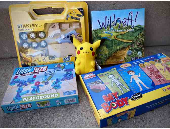 LiquiFuze playground kit, Wildcraft board game, My Body poster, Stanley dump truck building kit.