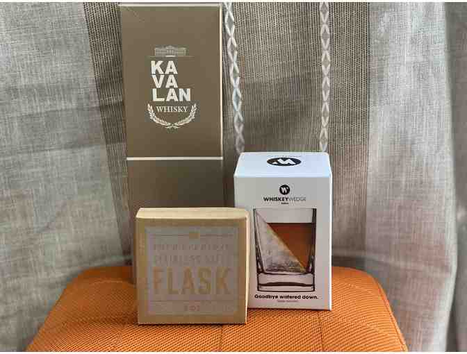 Kavalan Whisky Classic Whisky (Kavalan Distillery Selective), Whisky wedge glass, Stainless steel flask.