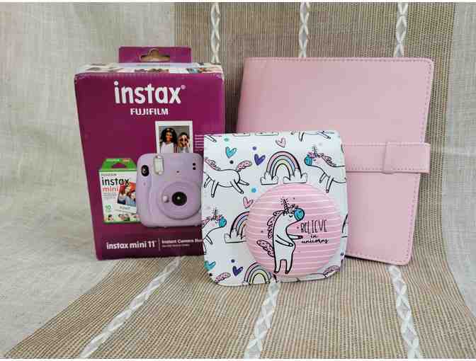 Instax mini 11 camera bundle by FujiFilm, photo album for Instax minis, and a camera bag.