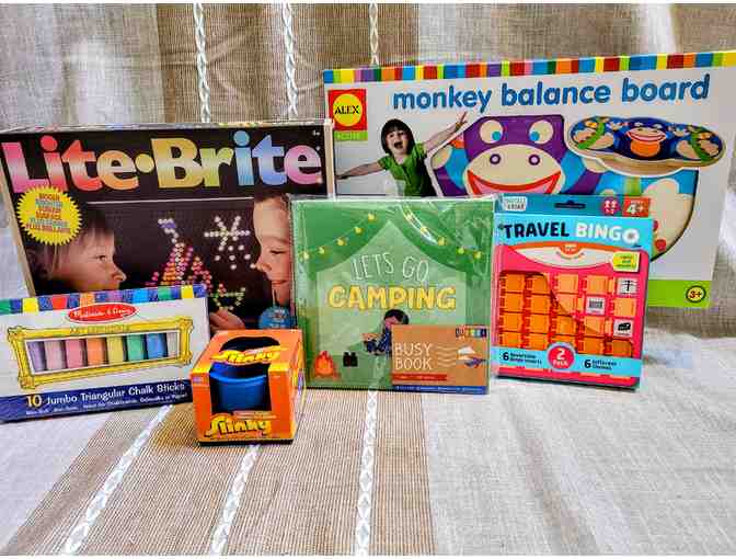 Alex Balance Board, Lite Brite, Melissa & Doug Chalk, Travel Bingo, Felt Camping Book, and a Slinky