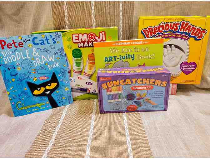 Pete the Cat Doodle & Draw book, We are in an Activity Book, Precious Hands plaster kit, Crayola emoji maker, Lakeshore Learning suncatcher kit.