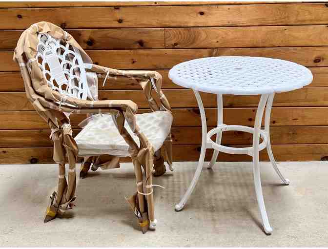 Beautiful white outdoor or indoor bistro set with 30 inch round table and two chairs