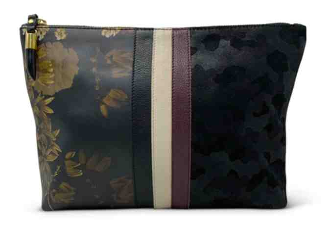 It's a perfect clutch.. or to carry inside your larger bag, keeping it all organized while you're on the move- you can stash a lot in this sleek silhouette! Black camo suede paired with dark peonies on buttery soft cowhide, plus black, chalk and oxblood racing stripes down the middle is piecey perfection!