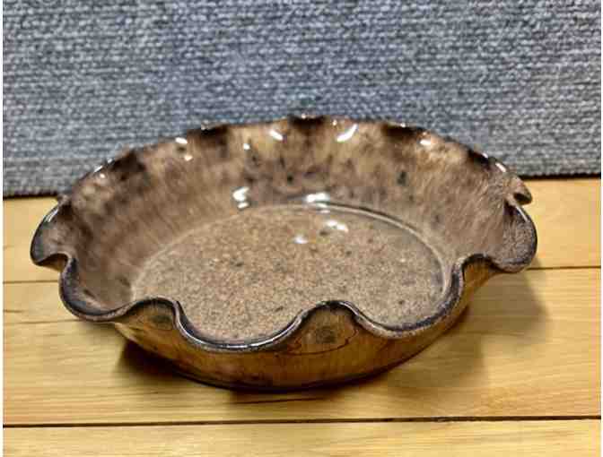 Light brown shallow ceramic bowl with wavy edges. Looks like a small pie plate.