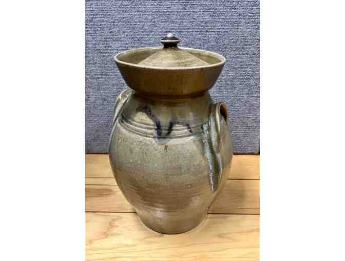 Large ceramic vase with lid. Darker pastel color with darker swirls. Handle-like holds on each side with a wide opening and lid. Could be used as a cookie jar.