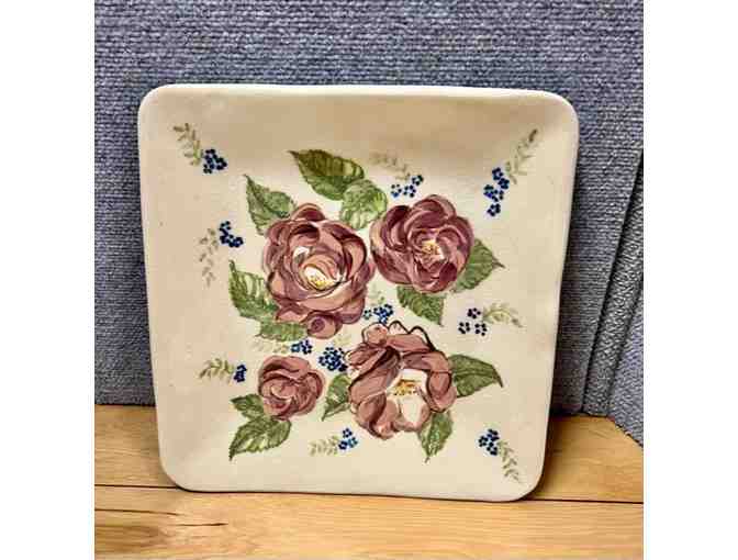 Large square ceramic platter - Beige with red flowers and green leaves in the center.