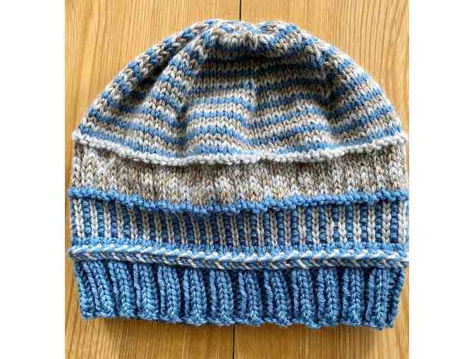 Hand Knit Adult Winter Hat (Blue/Gray/Beige)