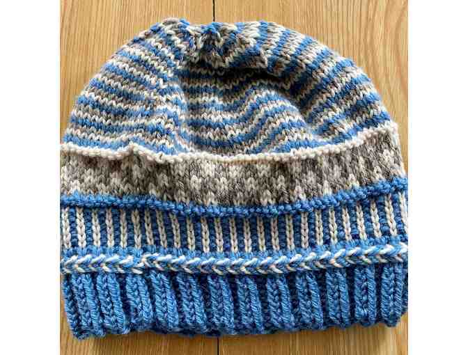 Hand Knit Adult Winter Hat (Blue/Gray/Cream)