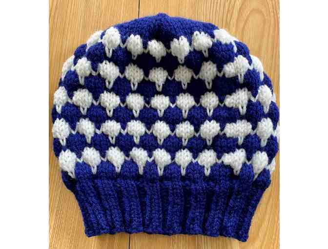This very warm hand knit striped adult beanie hat will keep your ears toasty warm on cold and windy winter days.