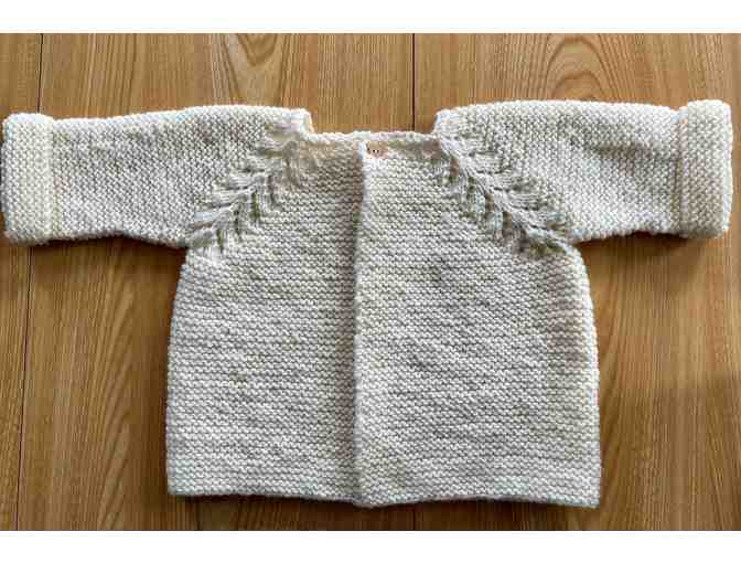 This cozy hand knit sweater will be your favorite sweater for baby. It is knit from the neck down with minimal seams. The circular shoulder area sets off the look. It has one button front closure with bear-themed button.