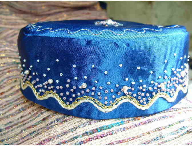 Hand-crafted blue satin Bukahari-styled kippah with off-white silk and golden hand embroidered waves contrasted with a cloud of lavender and white seed beads and crystal pearls on this band. The top features a hand beaded compass rose. Band circumference is 17 3/4 in (45 cm).