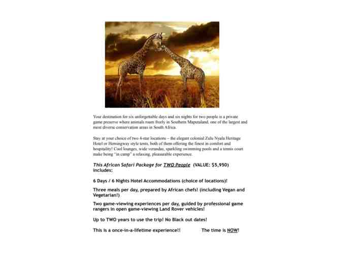 This African Safari Package for TWO People (VALUE: $5,950) includes: