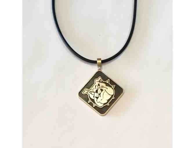 Custom Basis Bulldog pendant is on a black rubber 16” cord with a silver clasp. BASIS SCOTTSDALE 2017 is diamond cut engraved on the back.
