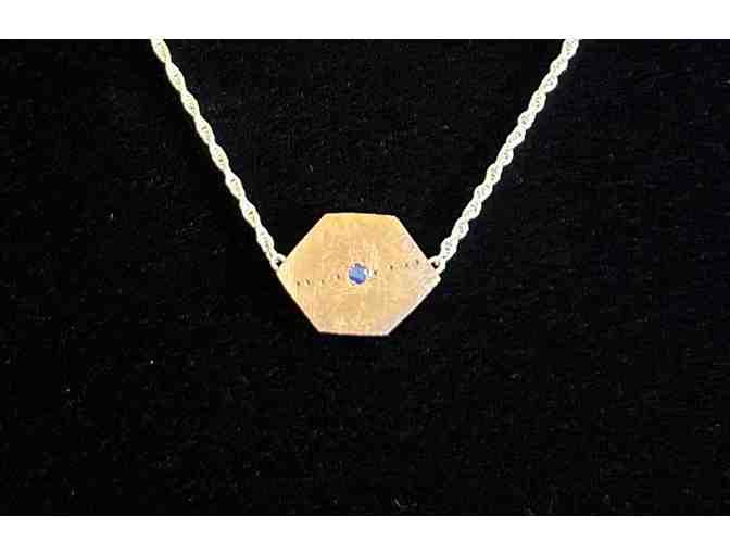 A 17" sterling silver twist chain and a stationary antique bronze hexagonal pendant with a sapphire center, handmade by a former BASIS Scottsdale parent.