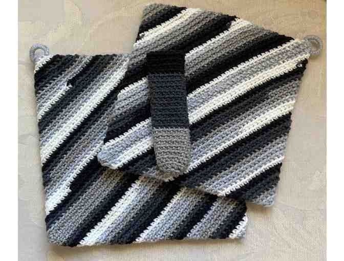 A one-of-a-kind set of 2 hand-crocheted potholders and a pan handle cozy.