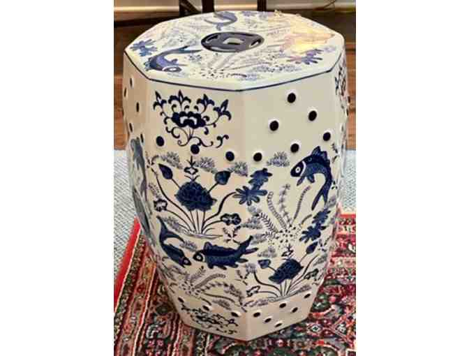 Stately and timeless in design, a ceramic garden stool, fashioned in a blue and white Asian inspired pattern.