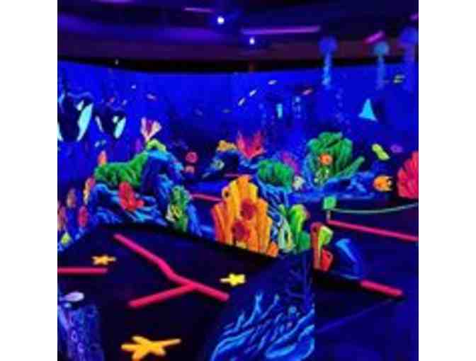 A UNIQUE WAY TO VIEW & PLAY 18 FUN HOLES OF MINI GOLF IN 3D! lmagine a world where one of a kind, hand-painted 3D art looks so real playing black light mini golf that you'll feel like you're trapped in a world of fantasy while encountering dragon caves, sunken pirate ships, and unicorns! Wow! How cool would that be!