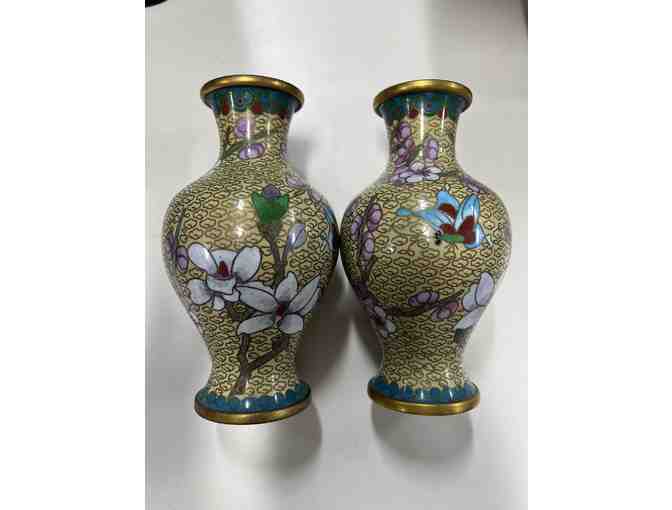 Set of two cloisonne vases. 2.25" base, 6.25" tall. Depicts beautiful flowers on branches with leaves.