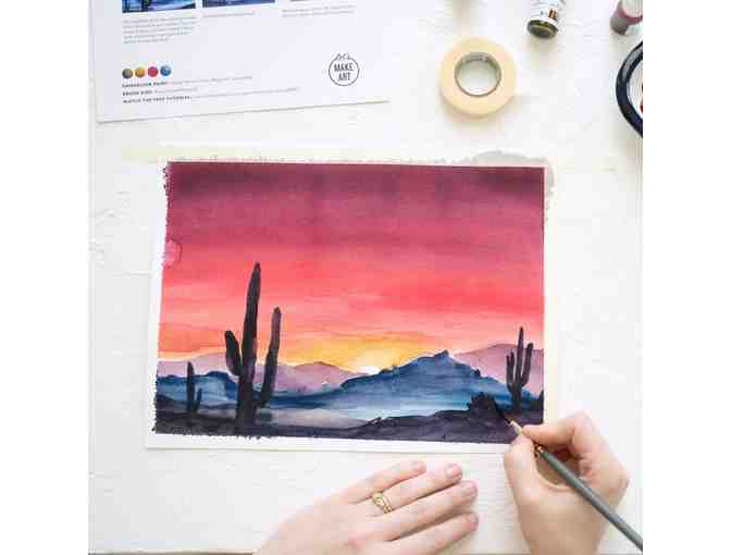 Take the guesswork out of watercolor and created this easy and fun kit from Let's Make Art. Follow along with the always-available and totally free video tutorial courtesy of our watercolor artist Sarah Cray. By painting a sunset view of a desert landscape, the instruction will focus on color transitions and creating depth in this vibrant scene.