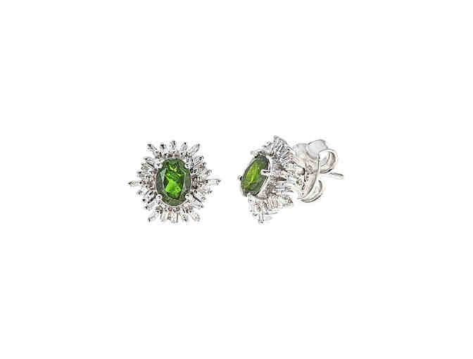 Set in sterling silver, faceted prong-set diamonds surround prong-set emeralds, giving this pair of earrings beautiful sparkle. There are approximately .41 ct. tw. Diamonds, with color=H, clarity S12; approximately 1.80 ct.tw. Emerald gemstones; earrings drop approx. 10mm and have post backs.