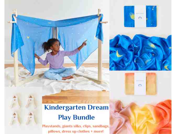 Playspaces are so important for a child's development and creative play! Our kindergarten dream play bundle comes with wooden playframes, four wooden clips and two giant silks from Sarah's Silks. Dress up items from Sarah's Silks are also included along with sturdy homemade sandbags (a sensory favorite in the kindergarten) and cozy cushions. Children love to engage in imaginative play and make cozy dens, build forts, and create play spaces of all shapes and sizes. This dreamy bundle includes donations from the Summerfield kindergarten families with the things they learned their children loved most to play with. All items are newly purchased or handmade while the play frames and clips are in like-new condition.