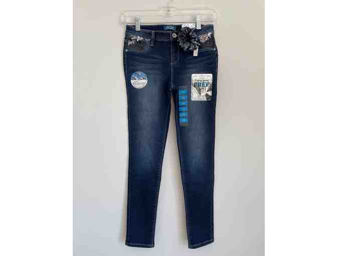 SQZ Girls Junior Size 12 stretch denim midnight wash color pants with flippable sequins and scrunchie.